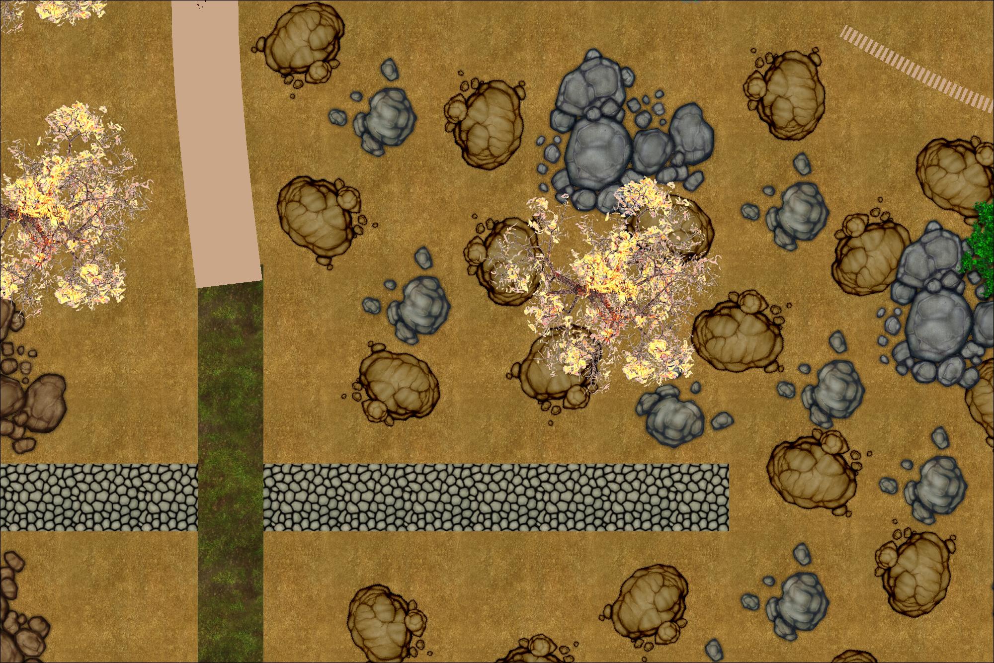 10. a number of rock piles, a gravel path, 2 bushes, a wide green path, a wide brown path