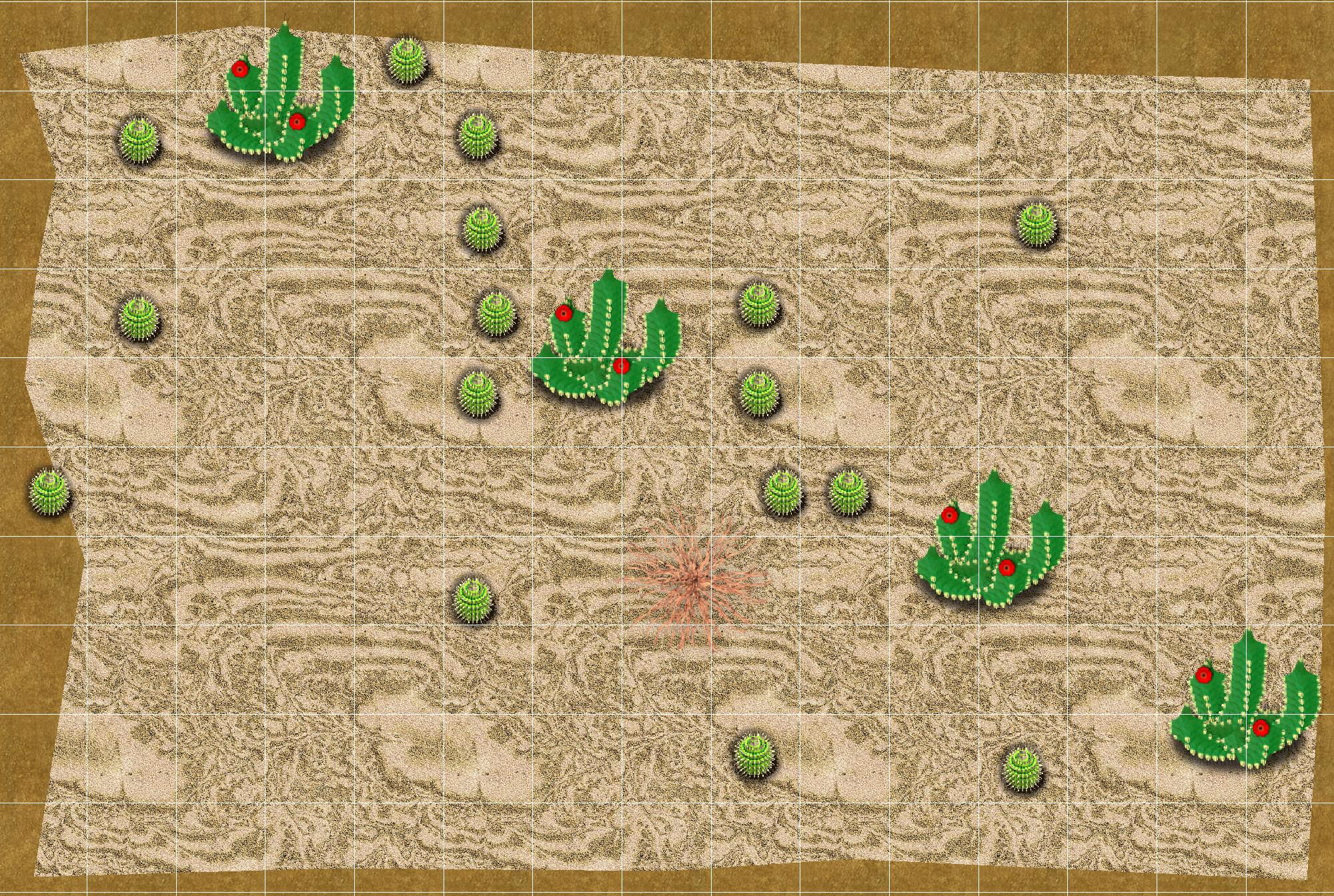 8. leafless brush, green brush, orange/yellow brush, wide path, 2 narrow paths, 3 skeletons, broken wall, pergole